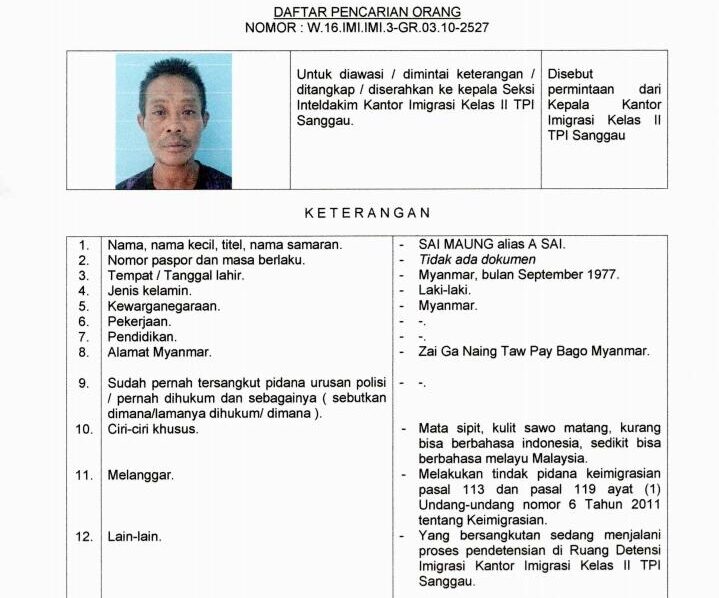 Surat DPO WNA Myanmar yang dikeluarkan Kantor Imigrasi Sanggau.